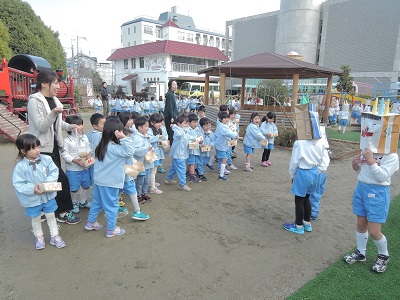 豆まき 2018.02.02 園だより 明日は2月3日の節分。幼稚園では、今日豆まきを 行ないました。災いや鬼を退治して新しい春を 迎える行事。子どもたちも、一所懸命に「オニは外!」 「福は内!」と言いながら、豆まきをしていました。