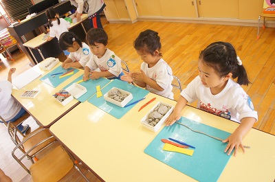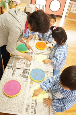 ▽はじき絵をするよ。描いたのは「ぼく、わたしのかぞく」