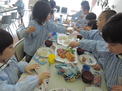 お別れ祝賀会 2018.03.15 園だより 今日は年長組さんのお別れ祝賀会がありました。 メインホールで、他の学年の小さいお友だちから プレゼントや歌の贈り物をもらいました。 みんなでお歌を歌っている時には、さみしくて 涙する子もいました。