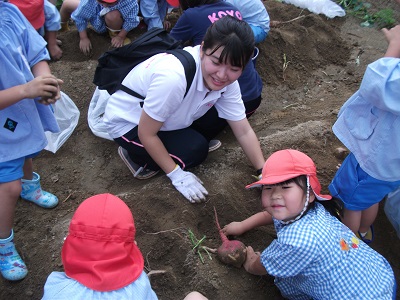 年長組おいもほり 2018.09.18 園だより 今日は年長組さんがお芋ほりへ行ってきました。 今年は、猛暑で雨なども多かったので心配していた お芋ほりでしたが、土の中で立派に生長していて くれました。とっても大きくていい色のお芋。 今からみんなで食べるのが楽しみです。