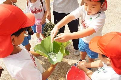 ▽蓮の葉っぱ、水をはじいてる!おもしろいね。