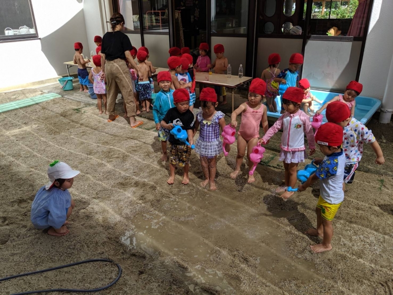 後期夏期保育1日目 2019.08.26 園だより 今日から後期夏期保育が始まりました。 みんな元気に登園して来てくれました。まだまだ、 暑い日が続きます。お天気の良い日には、水遊びや どろんこ遊びをして最後の夏を楽しみたいと思います。