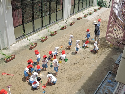 梅雨の晴れ間 2015.06.10 園だより 今日は朝から良いお天気で、気温も上がり蒸し暑い日でした。 園庭をかけまわって、一息つくのにミストシャワーに手を伸ばし 気持ちよさそうにしている子が印象的でした。 こんな暑い日は、お砂場でも水を使って気持ちよさそうに遊ぶ姿も みられました。