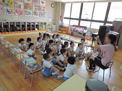 ドレミクラス 2015.06.24 園だより 今日は年少組ドレミクラスでした。中西カヲル先生のピアノに合わせて 動物になりきって飛び跳ねたり、すずの使い方を教えていただいたり しました。 給食はみんなの好きなハヤシライスでした。ハヤシライスもカレーと 同様大人気。たくさんの子がおかわりをしてくれました。