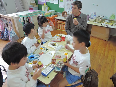 年長組焼き芋 2015.11.02 園だより 朝からの雨で年長組の園外保育が中止となりました。 楽しみにしていた子どもたちですが、園外には行けないけど、 園内で焼き芋をして楽しみました。 カメラを向けると黄色いホクホクとしたおいもを見せて くれていました。