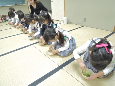 ホーム インフォメーション 子どもたちのおてまえ 向陽幼稚園のさまざまな情報をお知らせしています。 子どもたちのおてまえ 2015.11.24 園だより 今日は年長組の4回目の茶道でした。 少しずつ茶道にも慣れてきて、今日は上手に茶筅で お抹茶を点てていました。 BACK 一覧に戻る NEXT カテゴリー一覧 園だより イベント告知・報告 ひよこルーム しろろんくらぶ サタデーストリート PTAからのお知らせ りんどう組 課外教室 ぽぽら お知らせ 動画配信 ぽぽら・ひよこルーム 子育て支援 ご紹介 採用情報