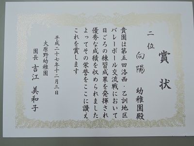 バレーボール交流戦 2015.12.03 PTAからのお知らせ 本日行われていました第5回洛西・乙訓地区バレーボール交流戦 で向陽幼稚園のチームが2位の成績を収められました。 おめでとうございます。 お母さま方、ご苦労さまでした。