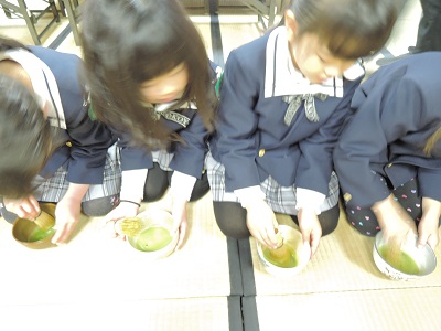 茶道おけいこ 2016.01.19 園だより 今年初めての茶道のおけいこ。年長組は3月の親子茶会に 向けて、茶道のおけいこを頑張っています。 苦かったお抹茶にも少しずつ慣れ、おやつを楽しむ子ども も出てきました。