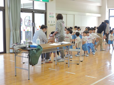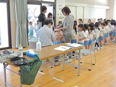 内科検診 2016.04.26 園だより 今日は内科検診。毎年、三菱京都病院小児科の野崎先生に 来ていただき、子どもたちを診ていただいています。 初めての内科検診に怖がっていた子どもも、お友だちをみて、 上手に静かに検診を受けていました。
