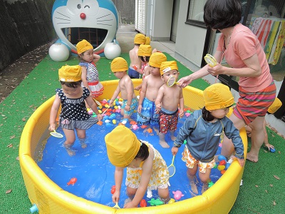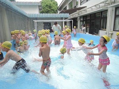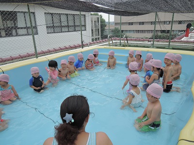 水が恋しいですね 2016.06.22 園だより すっきり晴れないものの、暑い日が続いていますね。 他のクラスの子どもたちがプールに入っていると、少しづつ、 みんながプールサイドに集まってきています。暑いせいか、 やっぱり、水が恋しいようですね。プールが自分のクラスに なると、喜んで水着に着替えてくれる子どもたちでした。