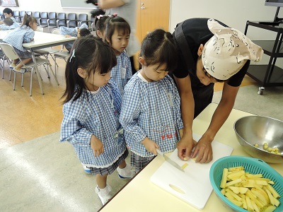 年長組終業式 2016.07.21 園だより 今日は年長組が終業式でした。明日からお泊り保育のため、 一日早い終業式でした。 お泊り保育の食事準備として、子どもたちは食材切りをして きました。 明日からのお泊り保育が楽しみですね。 年少・年中・ほし組は明日が終業式です。 年長児以外は、向陽Tシャツ・制服ズボン・制服スカートで 登園してきて下さいね。